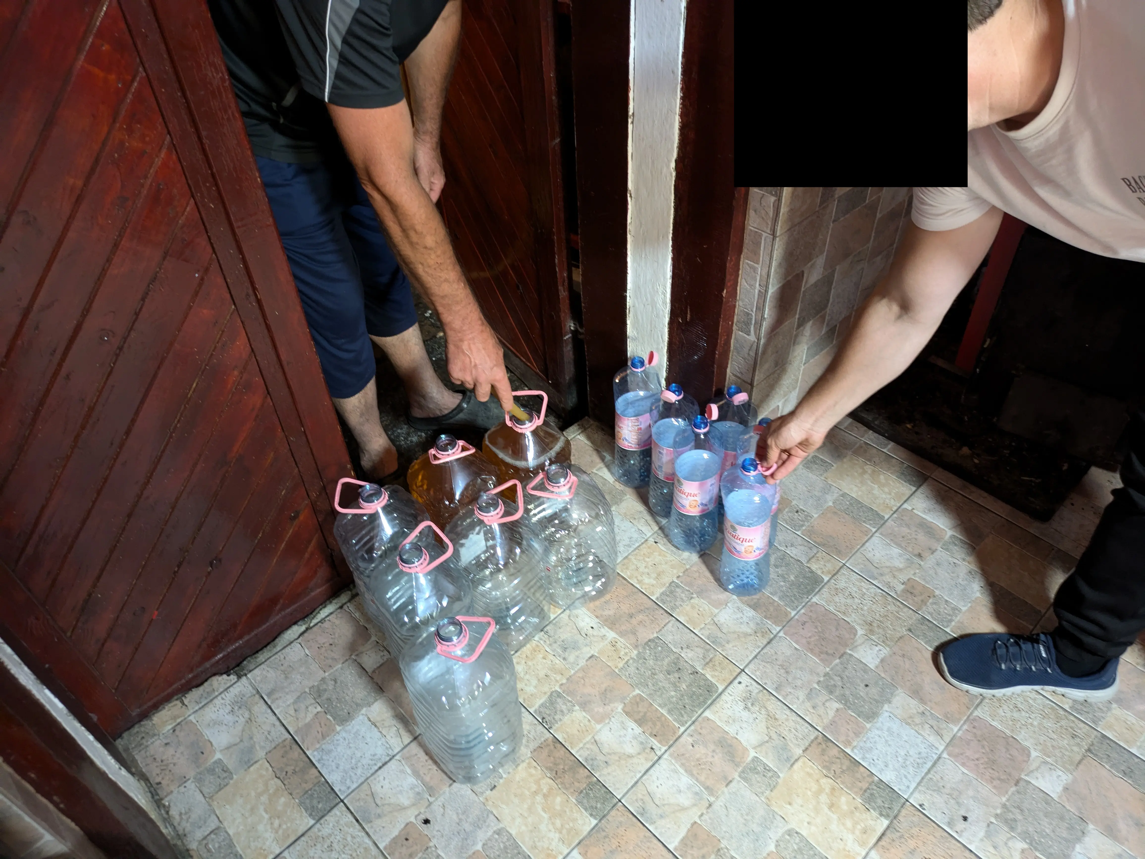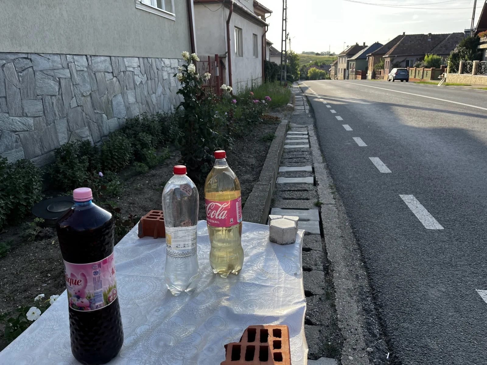 Nous étions venu voir une personne en particulier. Une femme sorti de sa maison pour nous accueillir, et ils discutèrent un moment (toujours en magyar). Elle s’absenta un instant et revint avec une bouteille d’eau minérale de 2 litres, remplie de vin rouge.